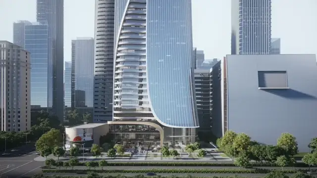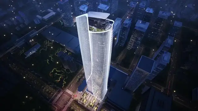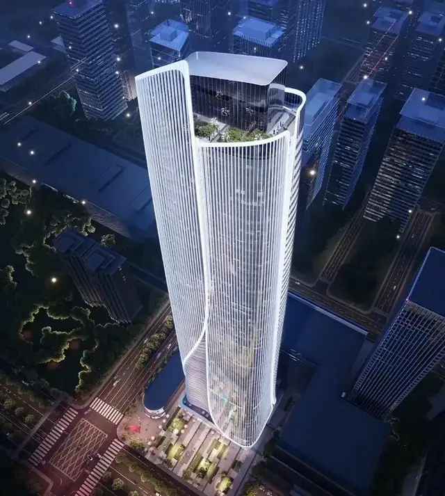 设计团队在面对周边错综复杂的城市景观时,采取“以简驭繁”的策略,运用充满流动感的造型语言,使塔楼在纷杂的城市背景中脱颖而出。建筑外观以柔和的弧线与圆角处理勾勒出挺拔形态,结合夜间灯光效果,更凸显出流线型的动态美感。