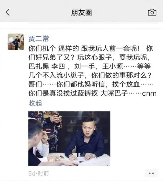 而就在昨天,作为驴家的代言人“二子爷”,在微信朋友圈公开点名了巴扎黑、李四、刘一手和王小源,喊话这几个逼样的在玩人前一套,让这些人听信,开始挨个放血,让他么嗯见识见识蓝裤衩的大嘴巴子。