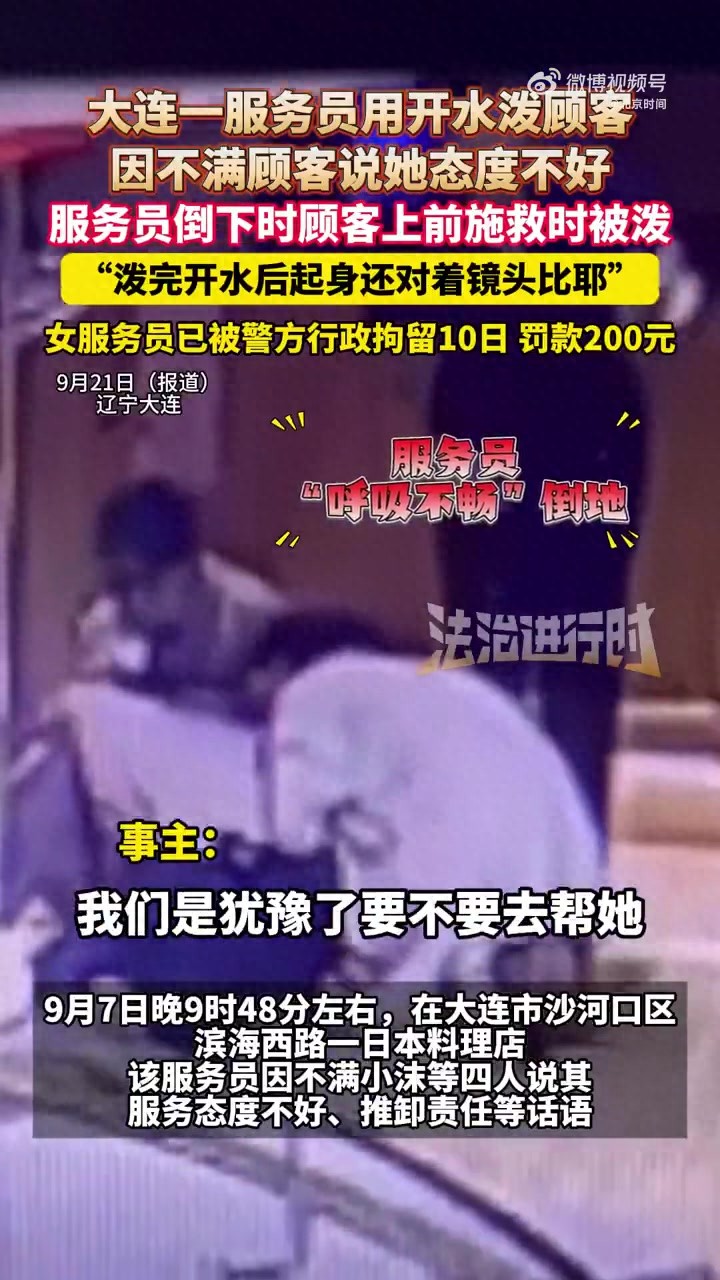 据9月8日大连市公安局沙河口分局出具的《行政处罚决定书》,经查明,9月7日晚9时48分左右,在大连市沙河口区滨海西路一日本料理店,该服务员因不满小沫等四人说其服务态度不好、推卸责任等话语,用水壶接取开水,将一壶开水泼到小沫身上,造成小沫双臂部位及前胸部位部分被烫伤。依据治安管理处罚法,警方给予该服务员行政拘留10日,并处罚款200元。