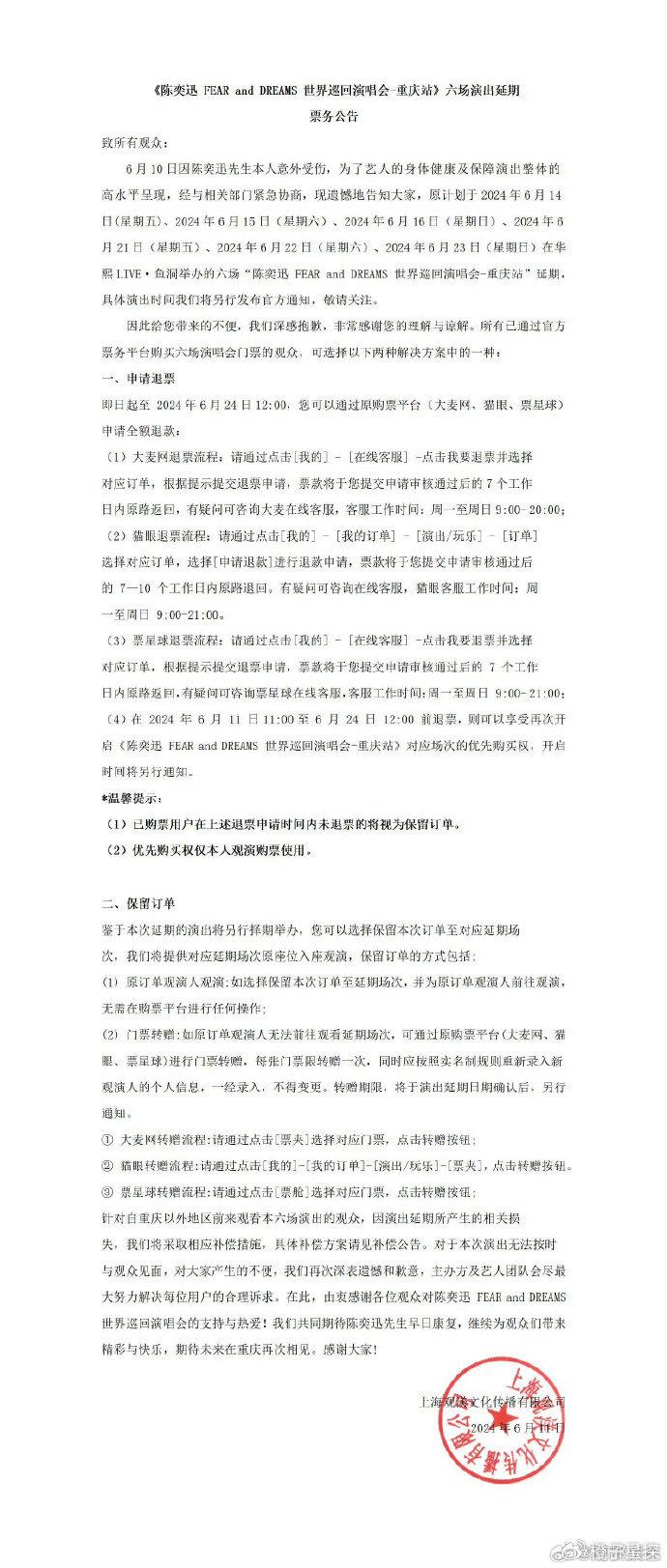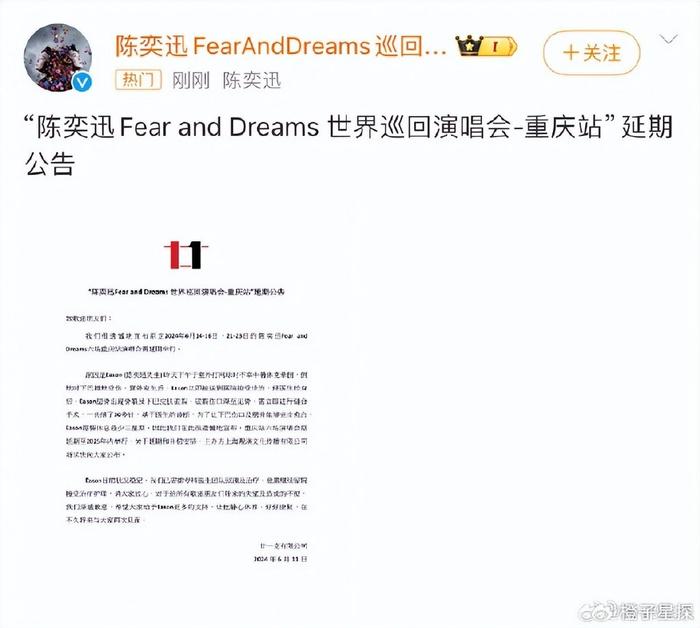 这一消息迅速在社交媒体上引发了广泛关注。许多歌迷纷纷留言表示对陈奕迅的关心和祝福,希望他能够早日康复,重返舞台。同时,也有不少网友表示理解和支持主办方的决定,期待陈奕迅在完全康复后能够为大家带来更加精彩的演出。