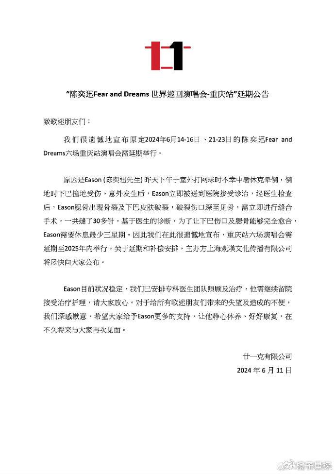 医生表示,基于陈奕迅的伤势情况,为了确保下巴伤口及腮骨能够完全愈合,他需要至少休息三周的时间。因此,原定于近期在重庆举行的六场演唱会不得不延期至2025年内举行。对于这一突如其来的变动,主办方深感遗憾,并承诺将尽快公布延期和补偿的具体安排。