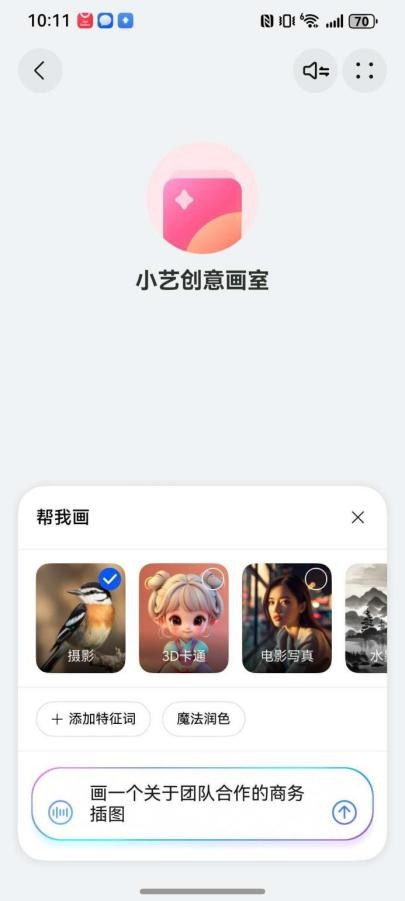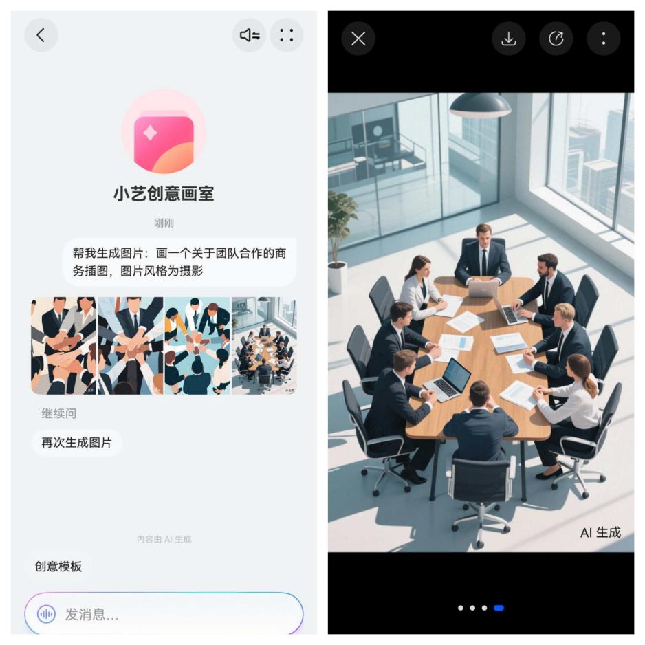 就在我被一张PPT插图难住时,我决定求助“赛博同事”——升级鸿蒙5后,Pura80里的小艺创意画室Agent。我对TA输入了一句简单指令:“画一个关于团队合作的商务插图”,并选择了显得专业的“摄影”风格。