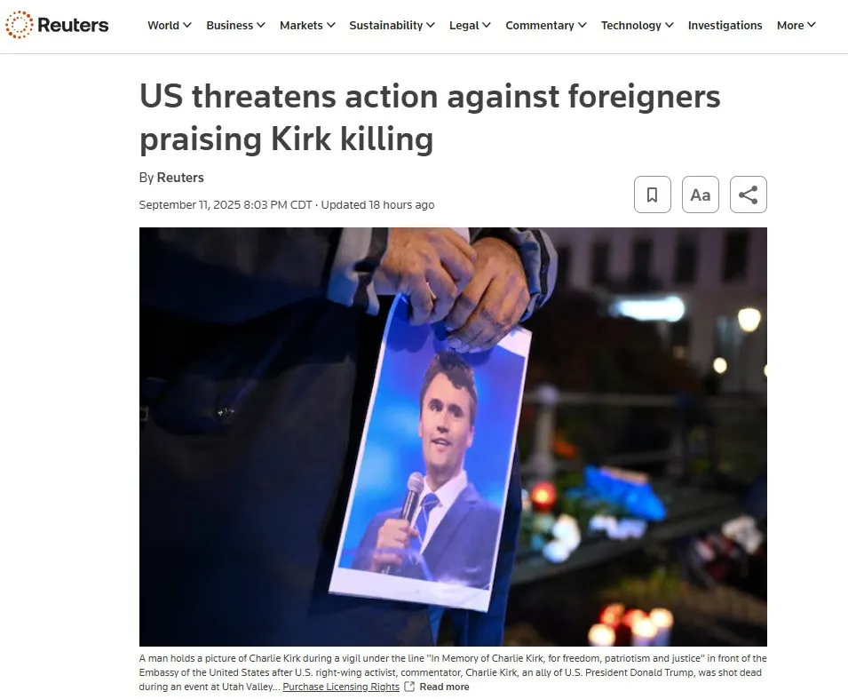 如今,柯克之死被纳入这一日益严苛的审查体系之中。这意味着,对于美国而言,“是否可能为暴力杀人行为喝彩”已成为筛选外国人能否入境的新标准。