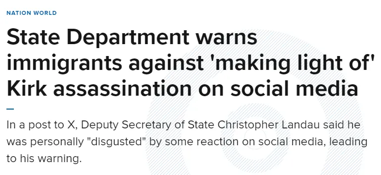 任何外国人在网络上“赞美、合理化或轻视”柯克遇刺事件的行为,都可能面临签证限制或入境受阻的处罚。他同时呼吁用户积极向国务院(State Department)举报相关内容,并透露领事部门将对此类信息保持高度关注与严密监控。