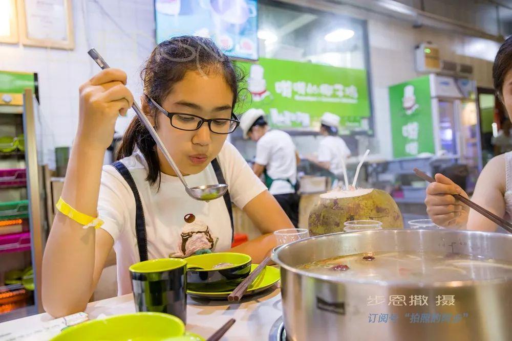 店员介绍他的做法是将用有名的 文昌 鸡和东郊椰林的椰子水一起烹饪出美味的食物,滋补润身、重食材轻烹饪。而在嗲嗲椰子鸡的口号是三个椰子炖一只鸡,所以锅底汤一定要喝上好几碗才行,然后再咬上一口有椰子味道的鸡肉,真是满足。
