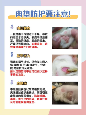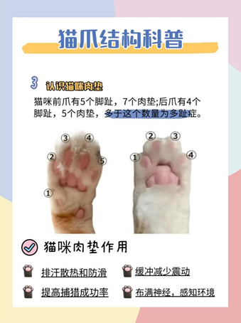 散热排汗:猫咪没有汗腺,肉垫是重要散热口,天热时会微微湿润;