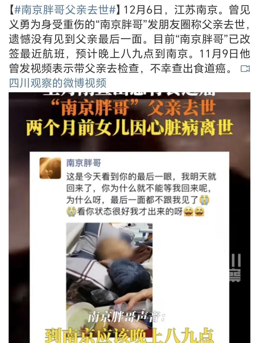 12月6日,曾见义勇为身受重伤的“南京胖哥”发朋友圈称父亲去世,遗憾没有见到父亲最后一面。他悲痛的喊话明明走之前还好好的,为什么不等等自己。让人更难过的是,南京胖哥的女儿9月份刚去世,真是噩耗连连啊。