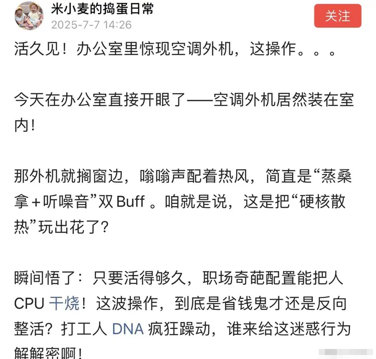 那外机就搁窗边,嗡嗡声配着热风,简直是“蒸桑拿+听噪音”双Buff 。咱就是说,这是把“硬核散热”玩出花了?