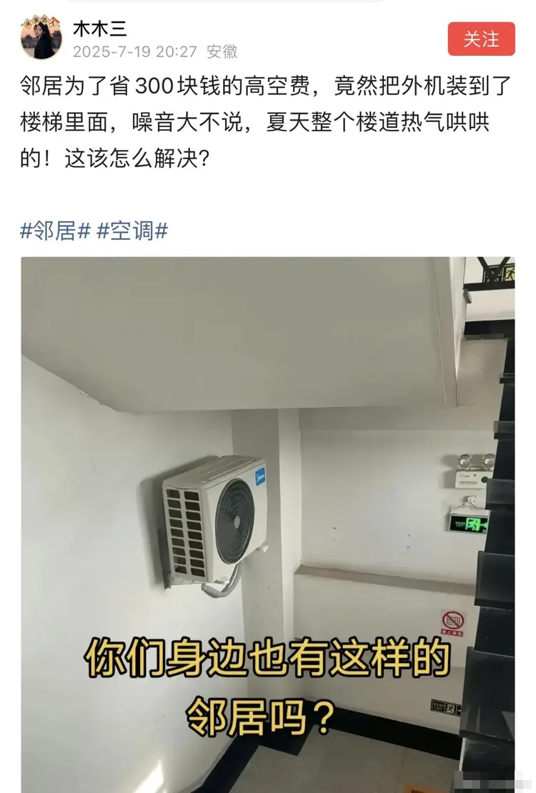 近日,一位来自安徽的网友爆料,邻居为了省300块钱的高空费,竟然把外机装到了楼梯里面,噪音大不说,夏天整个楼道热气哄哄的!这该怎么解决?