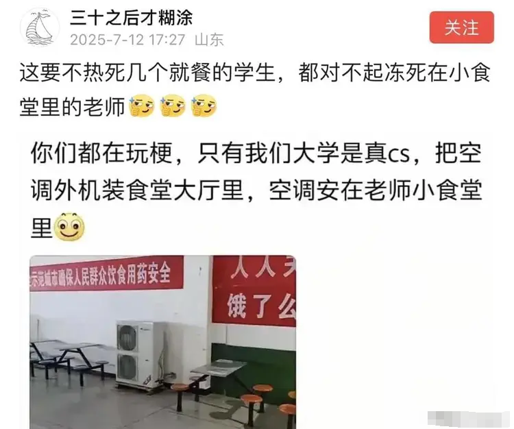 近期,一名大学生网友爆料称,这要不热死几个就餐的学生,都对不起冻死在小食堂里的老师。
