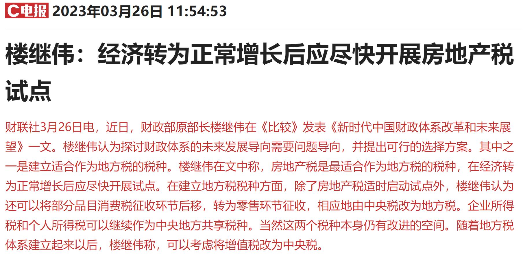 到了2023年,财政部原部长楼继伟表示:“房地产税是最适合作为地方税的税种,在经济转为正常增长后应该尽快开展试点。”