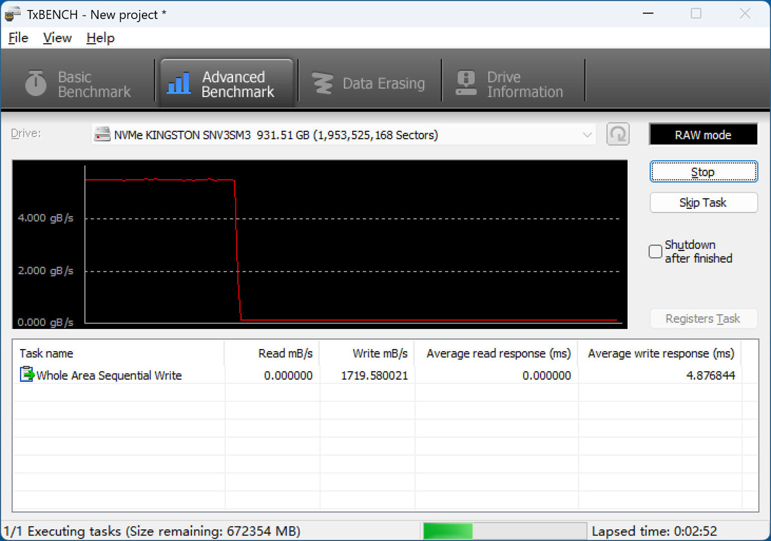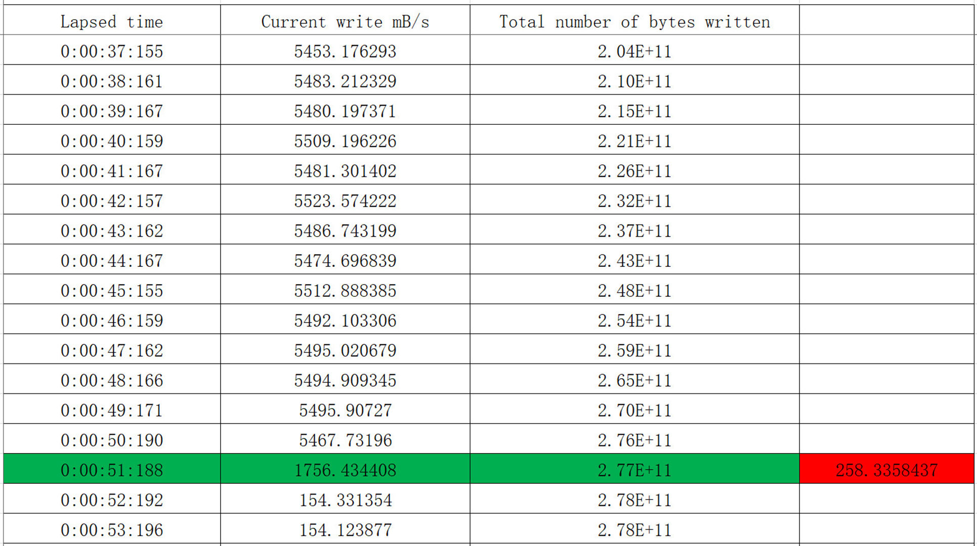 SLC Cache测试,该测试通过TxBENCH的进阶模式进行全盘写入,最后汇总写入曲线并估算SLC Cache的大小。