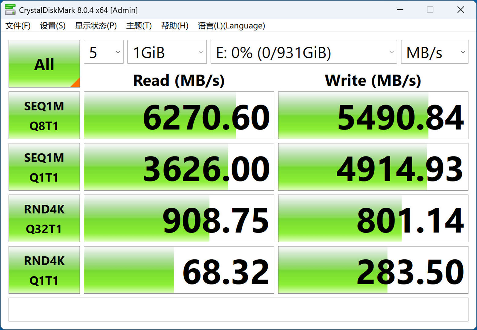 CrystalDiskMark理论性能测试。在空盘状态下,SSD的持续读、写速度分别为6270.60MB/s、5490.84MB/s,这已经超过官方的标称值了。