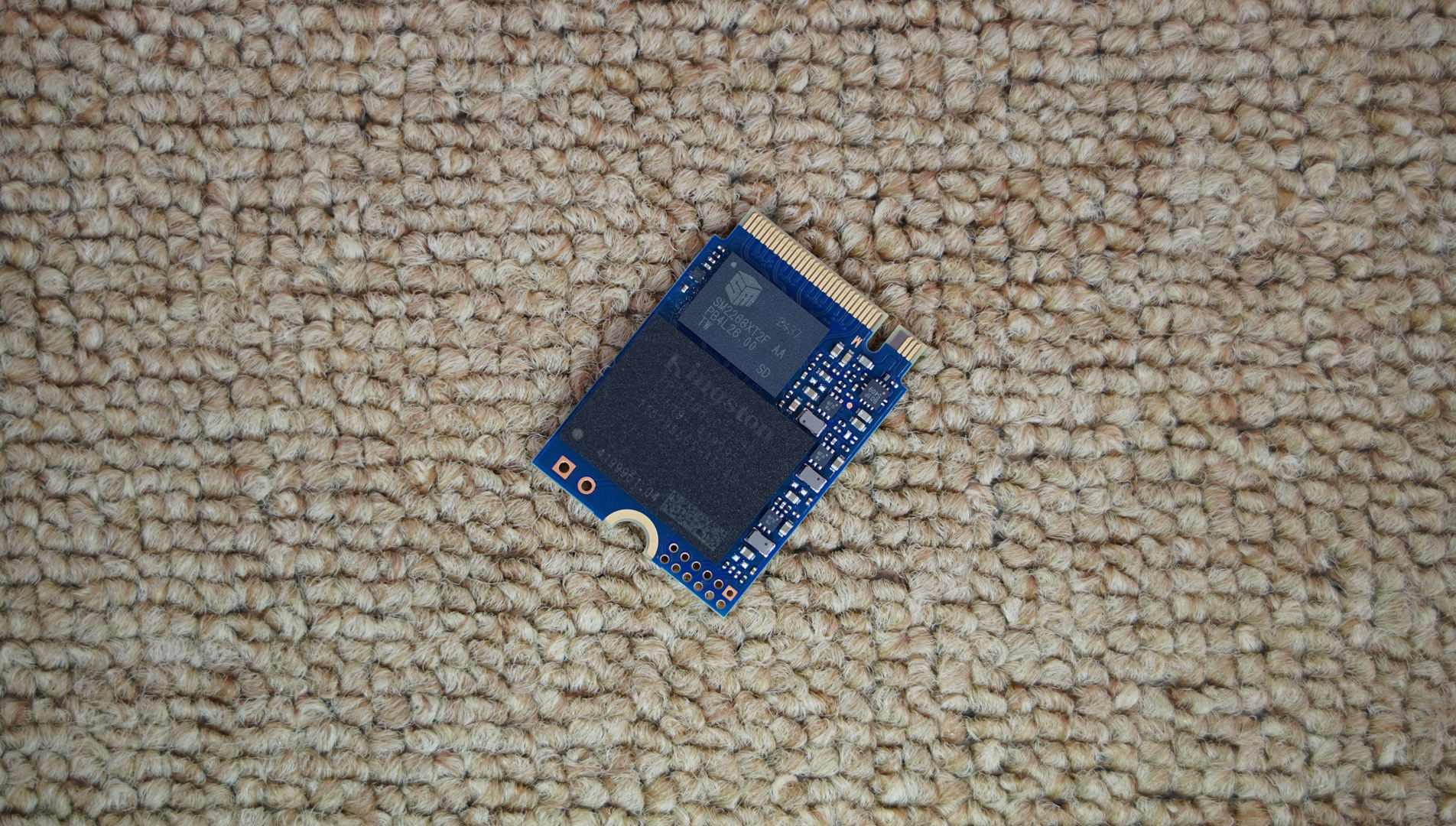拿掉贴纸,可以看出SSD由一颗主控芯片和一颗Nand颗粒组成,其中主控芯片为慧荣SM2268XT,Nand为金士顿自封装的QLC颗粒,单颗容量为1TB。