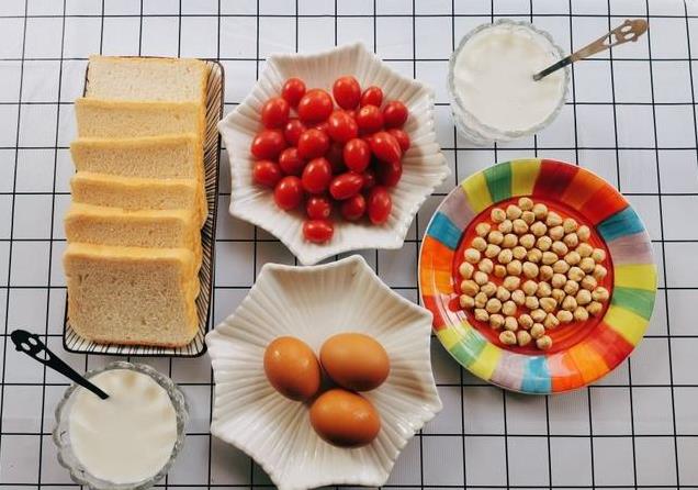 第三天早餐:牛奶+吐司片+水煮蛋+夏威夷果仁+圣女果