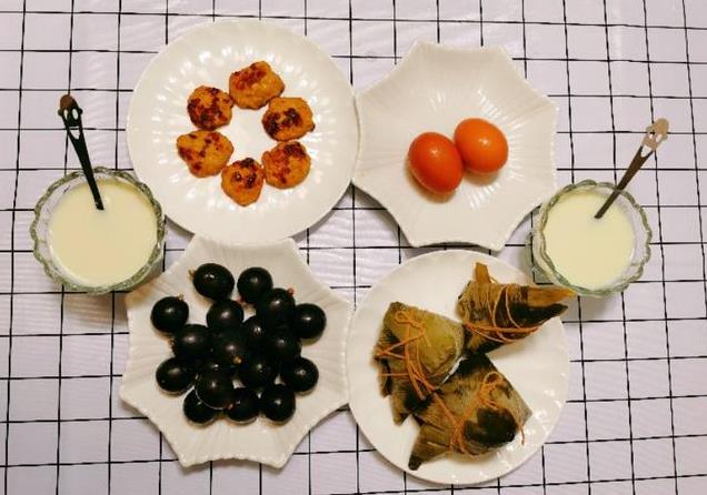 第四天早餐:牛奶+鲜肉粽+水煮蛋+上校鸡块+巨峰葡萄