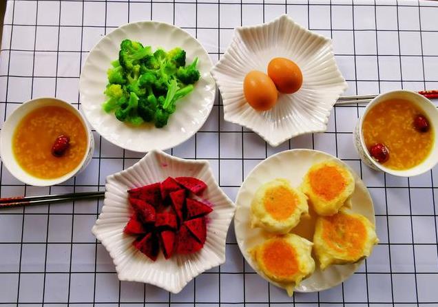 第二天早餐:南瓜红枣粥+猪肉水煎包+水煮蛋+凉拌西兰花+红心火龙果