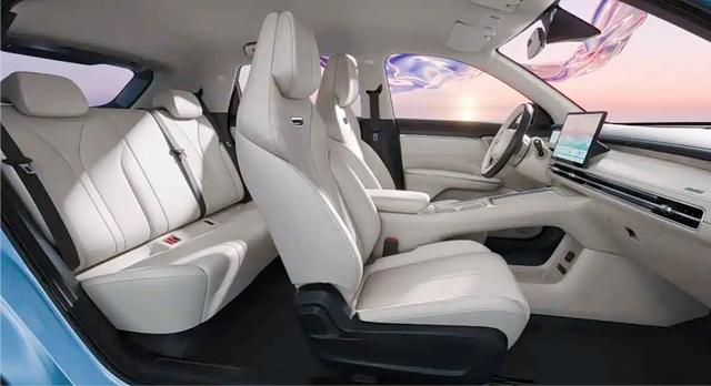 内饰部分虽然没有太多复杂的设计,但氛围感一点不差。方向盘是皮质的,还带多功能按键,操作起来很方便,搭配的是电子式怀挡,跟现在市面上很多纯电车的设计保持相同,上手没难度。值得一提的是,不管是基础款还是高配款,都标配了 8.88 英寸的全液晶仪表和 12.8 英寸的中控屏,两个屏幕大小有差异,中控屏更大,看导航、调功能的时候更清晰,也能突出中控区域的视觉重点。