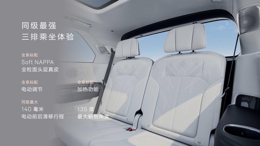第三排同样不打折。极氪9X采用一体式压铸后端铝车身与强化CD柱结构来保护碰撞安全,能承受时速105公里的追尾与侧碰冲击。第三排还拥有同级最强的乘坐体验,最大135度躺倒角度与同级最大140毫米电动滑移行程,加上专属独立天窗与“坐坐高升”布局,让第三排成为通透明亮的阳光房。