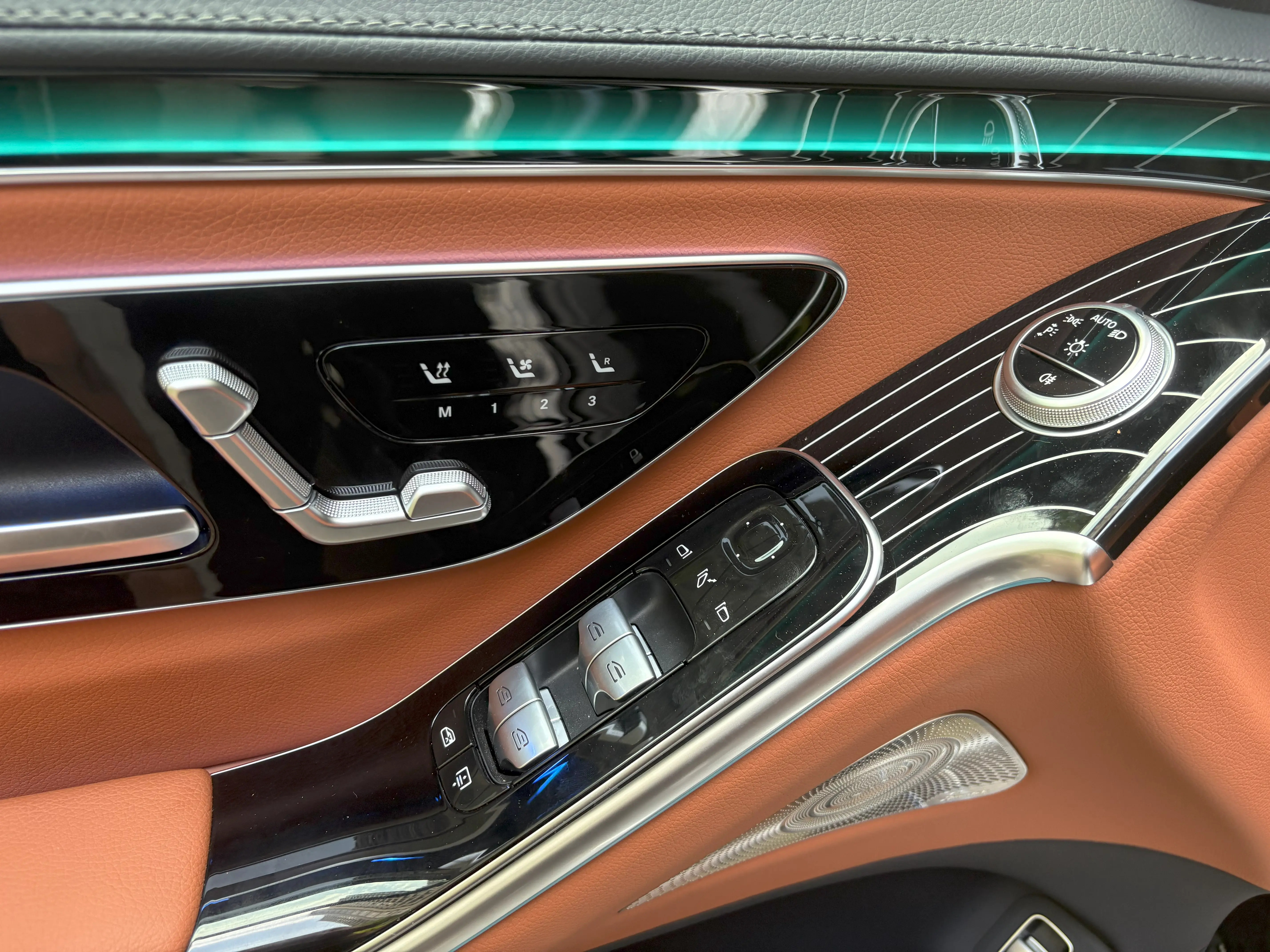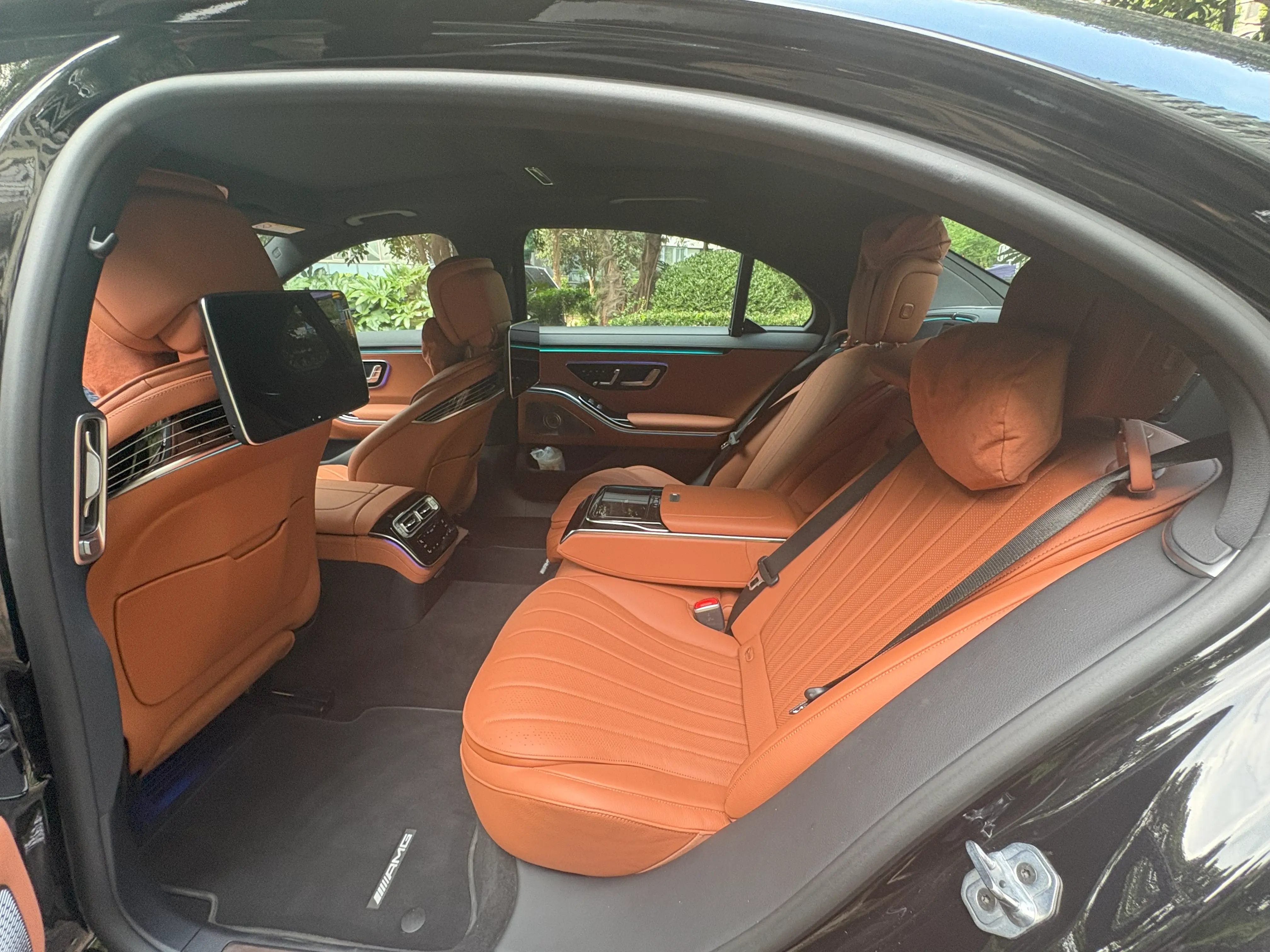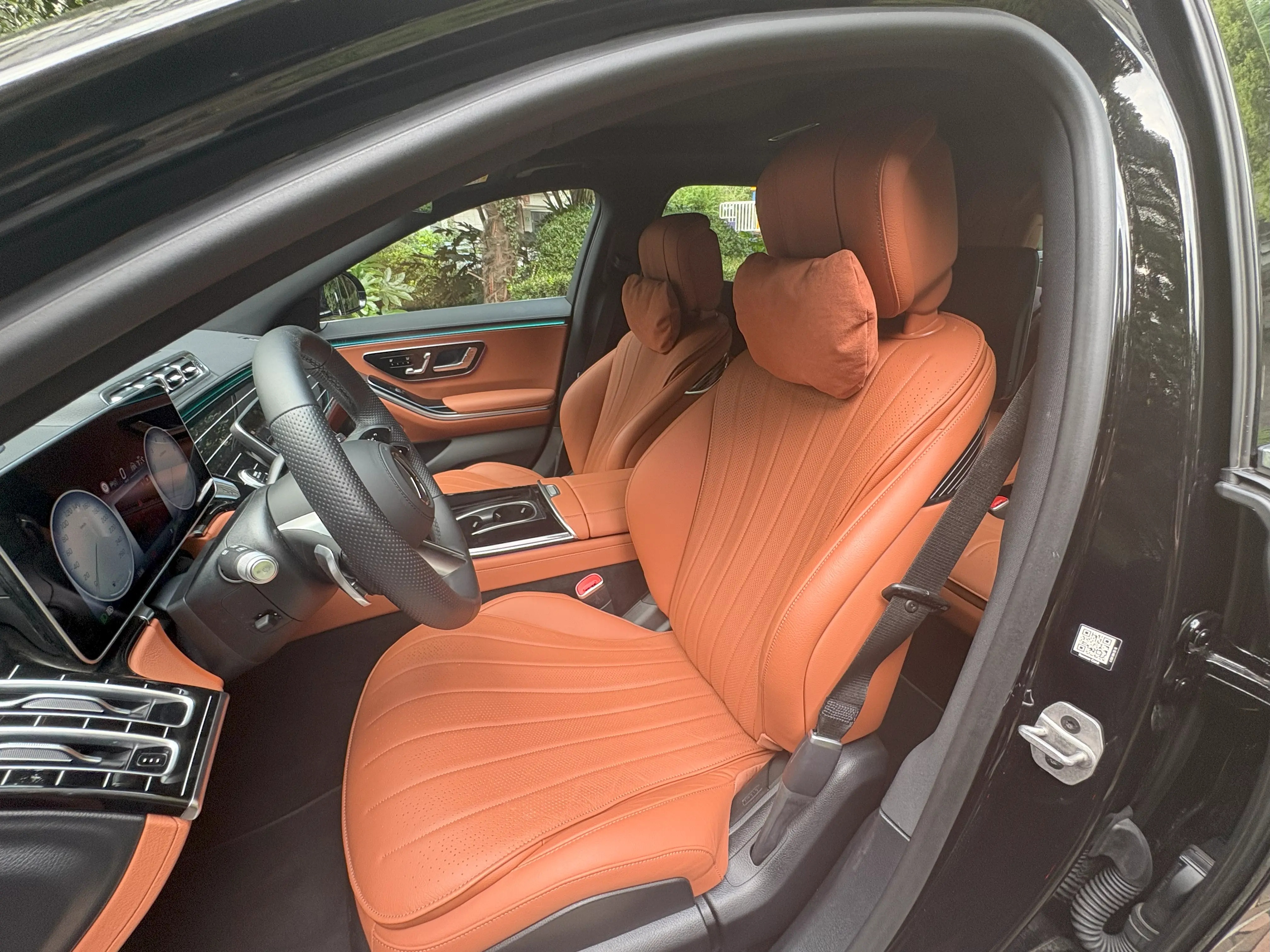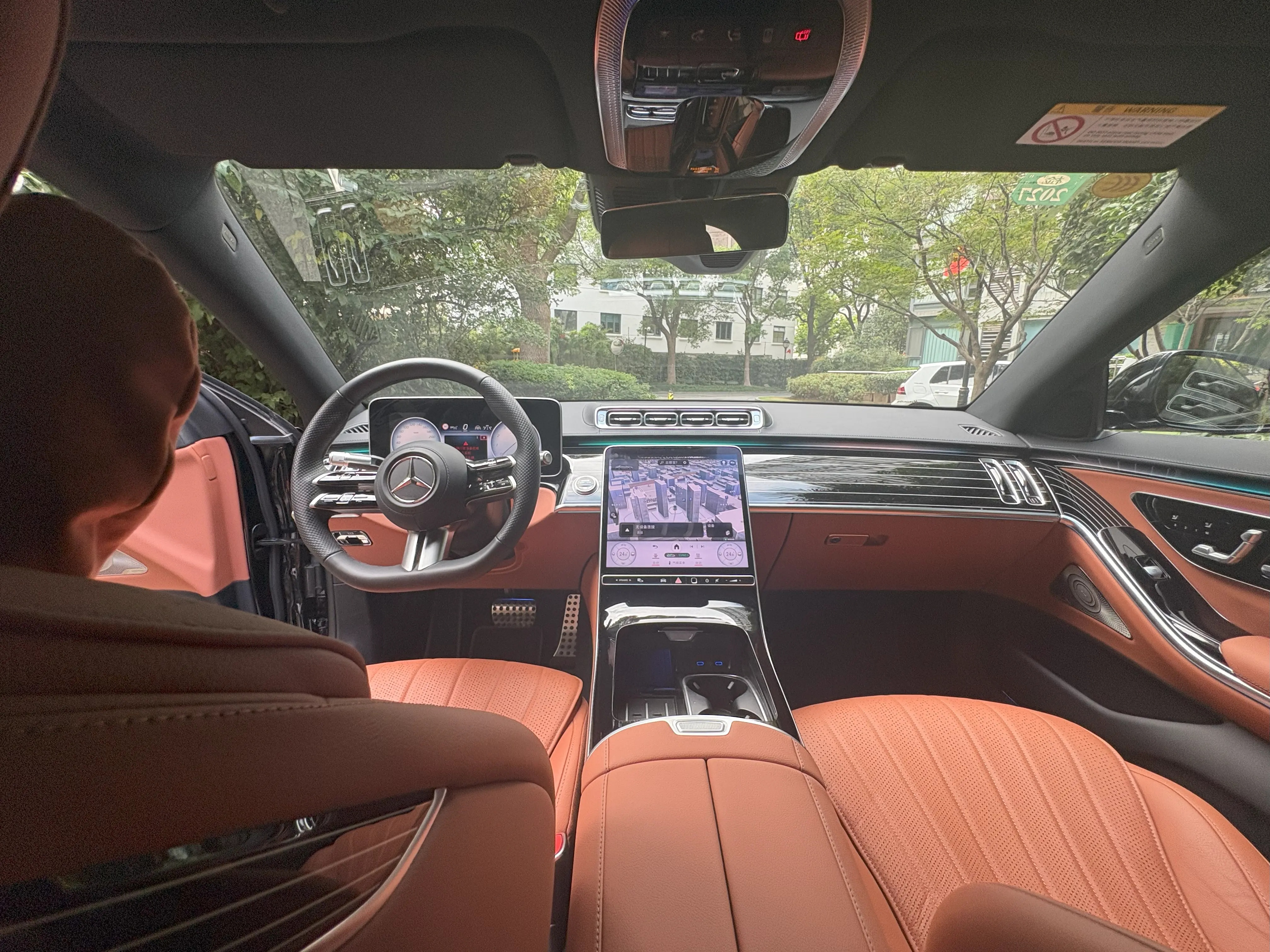 若说驾驶位的智能体验偏向实用,那后排则是“移动的豪华客厅”。双11.6英寸后排娱乐触控屏与7英寸MBUX智能平板电脑,可实现六屏互联——前排设定的导航路线,轻轻一划就能分享到后排屏幕;后排乘客也能将视频内容隔空投射到中控屏,多人出行时的互动性大幅提升。我们特意体验了后排行政座椅,43.5度的最大靠背角度搭配延长50毫米的小腿托架,加上10种按摩模式,长途乘坐的疲惫感瞬间消散。座椅表面的皮革触感细腻,每块皮革都经过2000帕压力的“水刀”切割,再用16000根针进行微型打孔,39000针的缝制工艺是定制西装的2倍,这种极致匠心,正是S级豪华底蕴的最好证明。