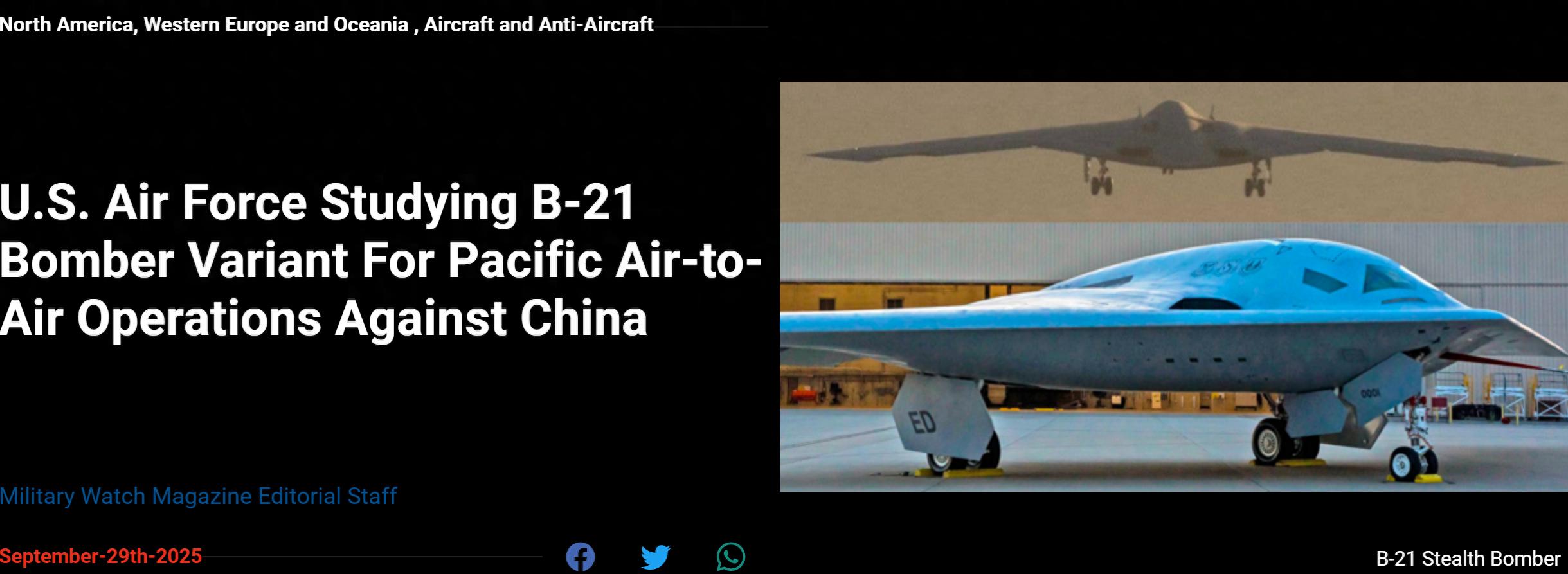 军事观察非常看好制空作战型B-21,认为B-21强大的隐身能力,能够让B-21在超视距空战中拥有强大的生存力;轰炸机的底子让B-21能够携带相当于一个甚至数个F-35战斗机中队的导弹;B-21巨大的航程,能让B-21无需空中加油即可在大半个太平洋作战,从而弥补北约国家飞机相较于中国同行航程偏短的缺点。