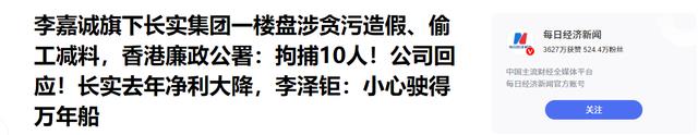 信息源:李嘉诚旗下长实集团一楼盘涉贪污造假、偷工减料,香港廉政公署:拘捕10人!公司回应!长实去年净利大降,李泽钜:小心驶得万年船 每日经济新闻 2025-05-23。