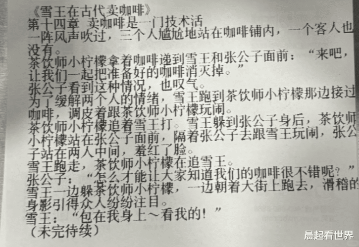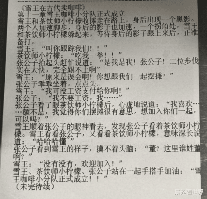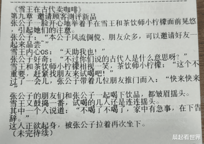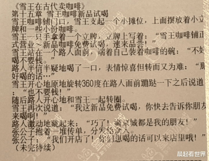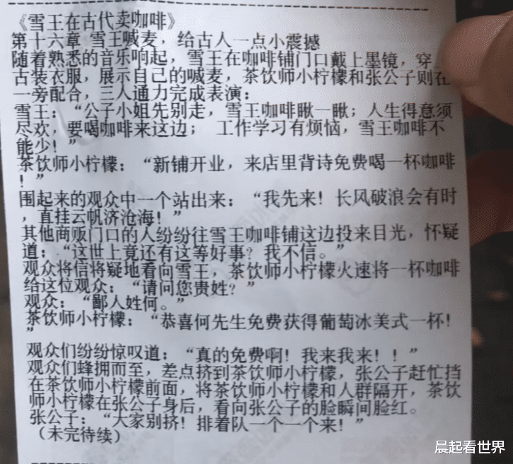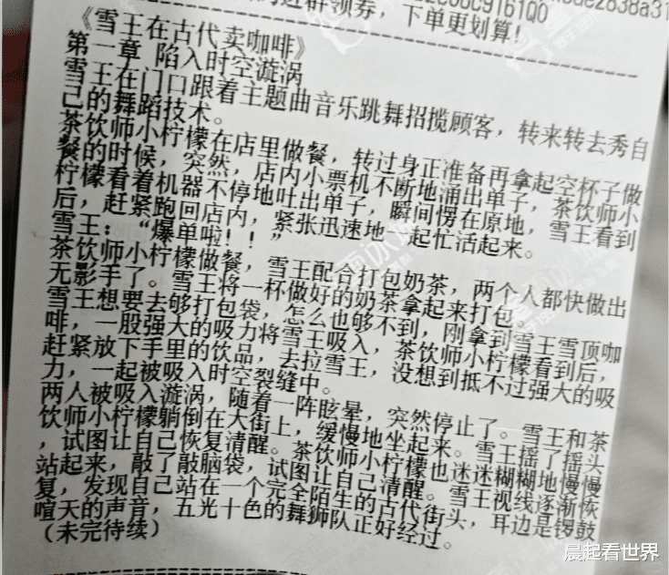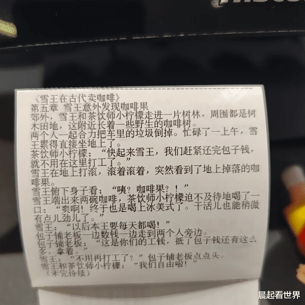 近日,有网友在社交平台发帖称,其在购买蜜雪冰城时发现小票上印有连载小说,讲述了“雪王”与伙伴小柠檬穿越至古代经营咖啡店的