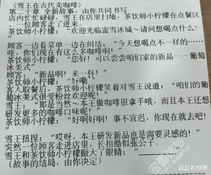 蜜雪冰城把“雪王”和伙伴小柠檬的穿越故事,印在了一张张购物小票上。这个故事被拆成不同章节,分散在不同订单的小票上,于是,为了看“连载”,网友们自发在社交平台上交换起章节,拼凑出一个完整的故事。