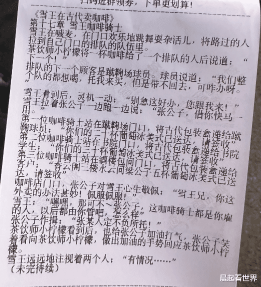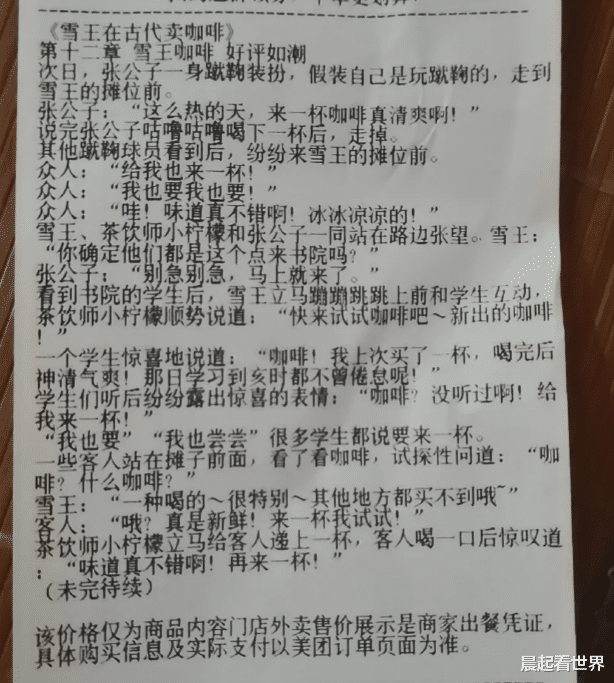 近日,有网友在社交平台发帖称,其在购买蜜雪冰城时发现小票上印有连载小说,讲述了“雪王”与伙伴小柠檬穿越至古代经营咖啡店的故事。该网友称“想看之前的(章节)”。帖子一经发出迅速引发关注,评论区成了“章节交换站”:不少网友晒出自己拍到的其他章节,有人调侃“大家拼拼凑凑,我仅花0元就看完了全文”,还有网友点赞品牌创意,直言“蜜雪招到了很会运营的小朋友啊”。