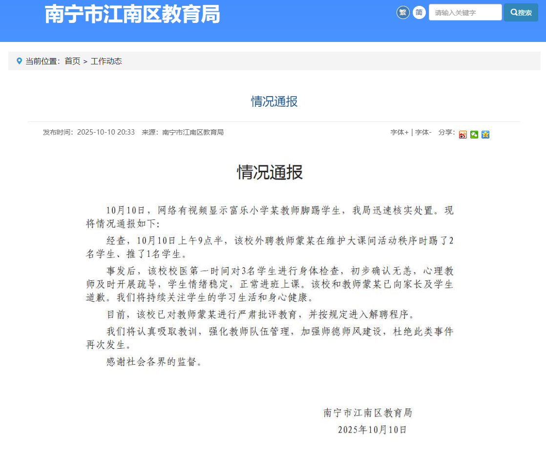 2025年10月10日上午,南宁市富乐小学外聘教师蒙某在维护课间秩序时,连续踢倒2名学生、推搡1名学生。事发后校方反应迅速:校医立即检查学生身体状况,心理教师介入疏导,确认学生未受伤且情绪稳定后,学生正常返校上课。当天,学校与蒙某向学生及家长公开致歉,江南区教育局连夜通报批评蒙某并启动解聘程序。该处理体现了对教师不当行为的“零容忍”,但同时也暴露了外聘教师管理的隐患。