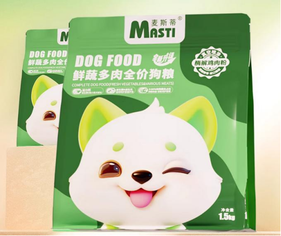 麦斯蒂狗粮采用鸡肉粉、鱼粉、糙米、大米等肉粉和谷物制作,植物蛋白占比较大,粗蛋白为30%,粗脂肪为11%。包装醒目标注主要产品特点,让消费者快速获取关键信息。设计风格偏向简洁、可爱,采用绿色色调,动画版本的狗狗给人活泼可爱的感觉,字体排版清晰有序。有不同的分量包装,6kg装适合多犬家庭或大型犬主人长期囤货;1.5kg精包装则满足尝鲜或小型犬需求。