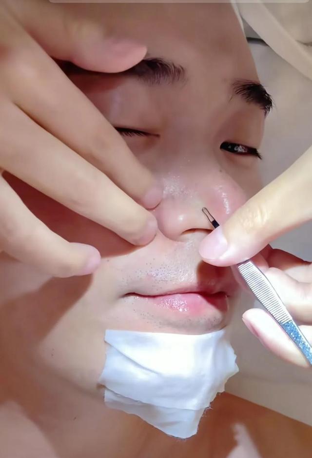 女技术则拿着黑头钳子十分仔细的给他鼻子做黑头清洁,陈赫为了证明自己没有黑头,还特地把手机镜头怼到脸上拍。