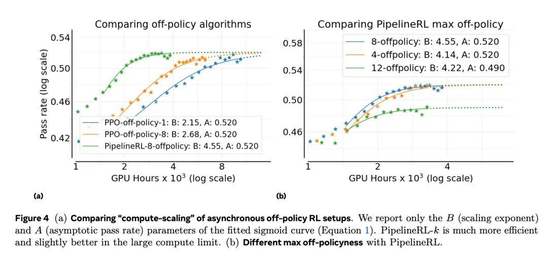 作者首先研究异步的 off-policy RL 训练结构,因为它决定了训练的稳定性与算力效率,并且通常独立于其他设计选择。具体来说,作者比较了两种 off-policy 学习方式:PPO-off-policy-k 和 PipelineRL-k。