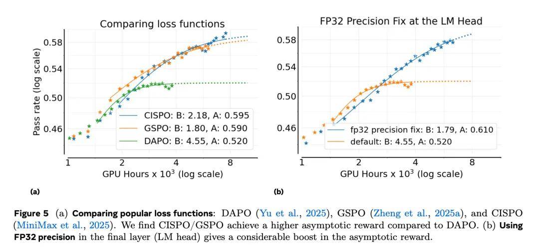 图 5a 表明,GSPO 和 CISPO 的表现都显著优于 DAPO,在最终通过率 A 上有大幅提升。CISPO 在训练过程中展现出更长时间的线性回报增长趋势,并在后期略优于 GSPO,因此作者选择 CISPO 作为 ScaleRL 的最佳损失类型。