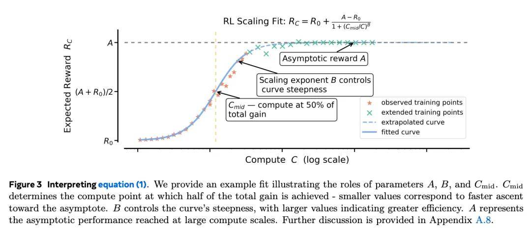 公式(1)中的框架使研究者能够根据小规模实验结果推测更大算力下的表现,从而在不耗尽算力预算的前提下评估 RL 方法的可扩展性。