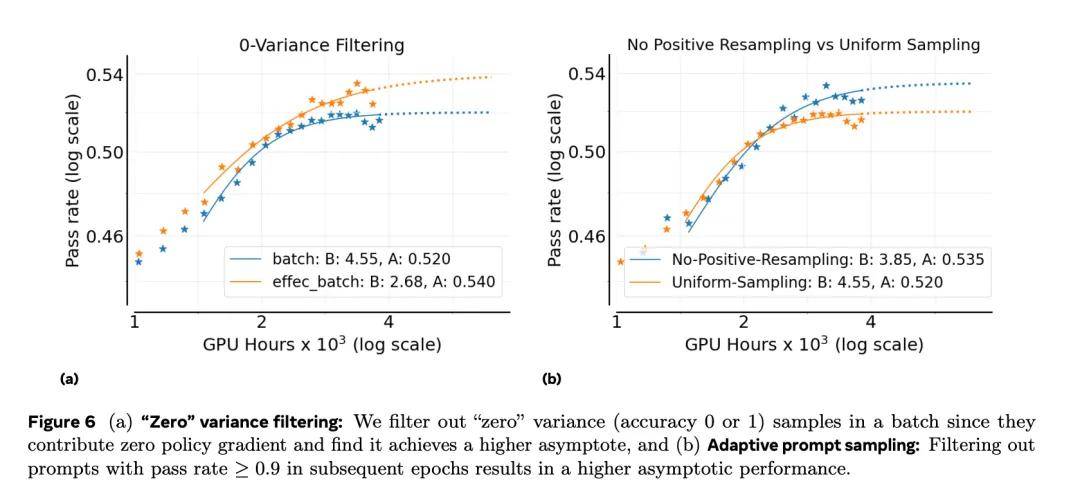 图 6a 中的结果表明,使用「有效 batch」(即过滤掉奖励方差为零的样本)可以获得更好的最终性能,因此作者在 ScaleRL 中采用该策略。