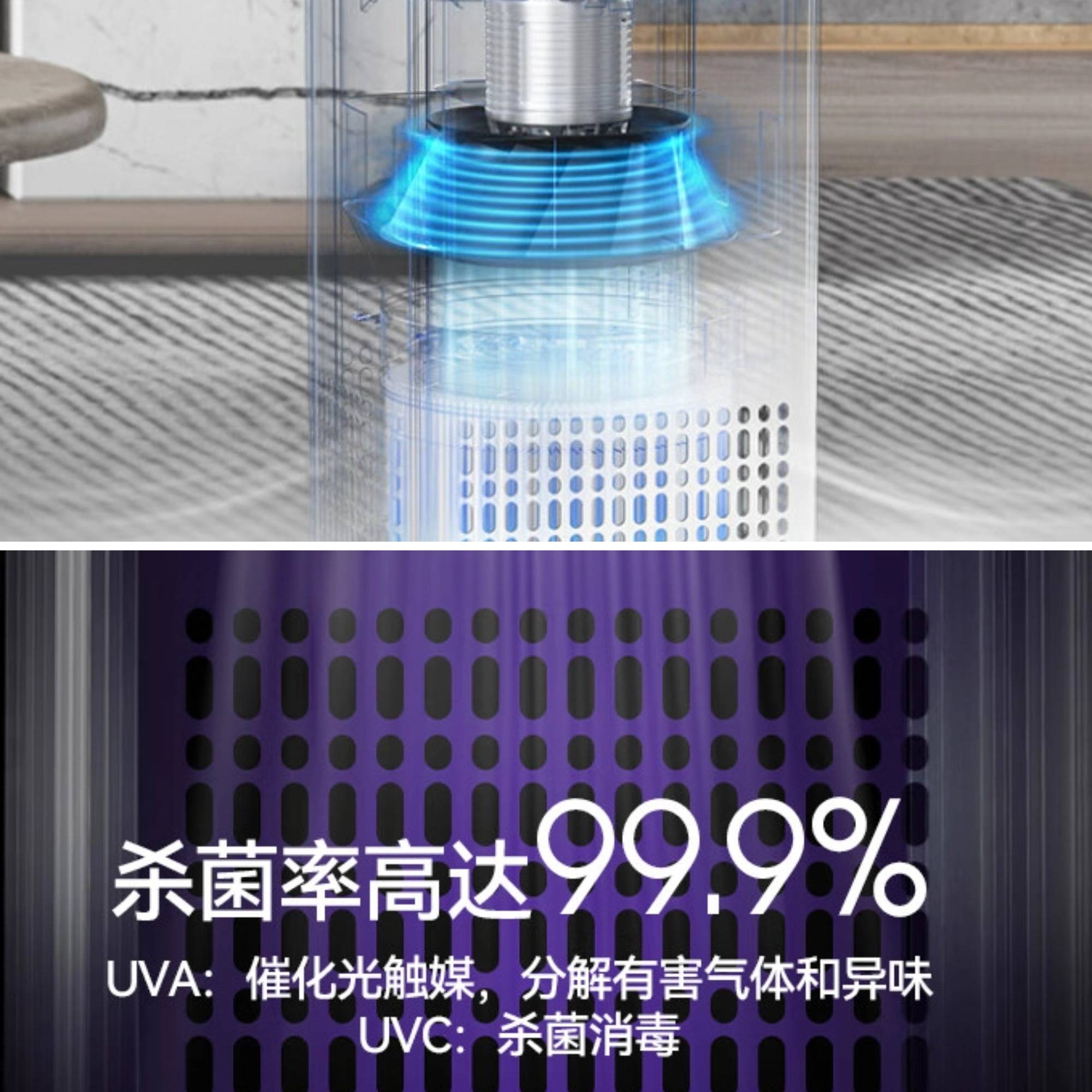 净化/消杀体系:采用“初效 + H13 HEPA + 光触媒”的三重滤网结构,叠加 UVC + UVA 双波段紫外线与 2000 万负离子,实现“截留—灭活—分解”的联合路径,杀菌效率可达99.99%,对宠物皮屑、异味与气态污染物都有系统性处理。