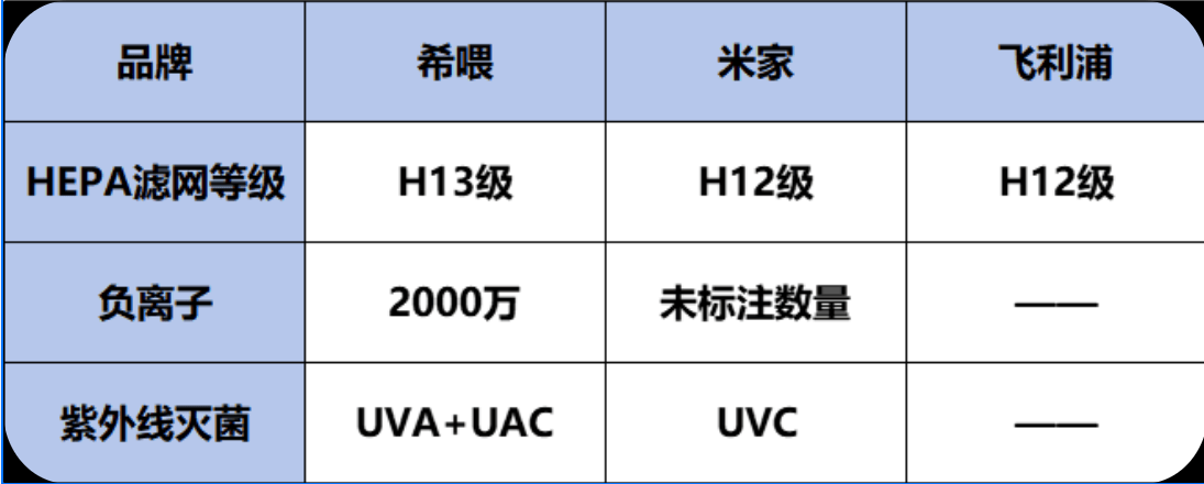 希喂:H13 + UVC/UVA 紫外线+ 2000 万负离子的组合把“截留—灭活”闭环打满,杀菌效率可达 99.99%,在本轮对比中综合实力领先。