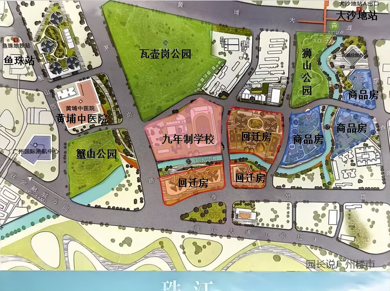 珠江春身侧环绕瓦壶岗、狮山、蟹山三大公园,内部有一条珠江涌穿流而过,构成了三山一河的山河园旧改大城。喜欢公园江景的朋友们可以考虑,毕竟鱼珠未来CBD+江景+公园的组合确实不太多。