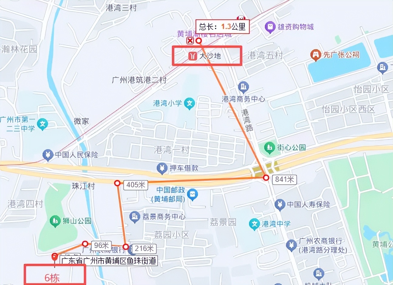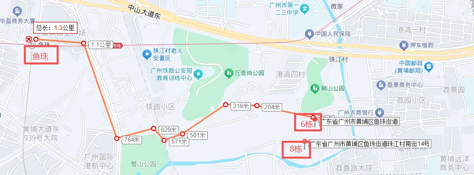 假设我是六栋的住户,我到鱼珠地铁站和大沙地地铁站的距离大概都是1.3公里,步行大要20多分钟,可能要考虑小电驴接驳。