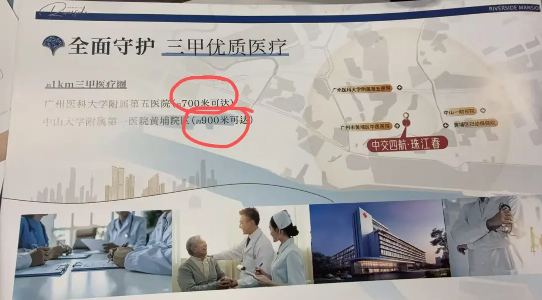 医疗方面,我看了一下珠江春的宣传海报,海报上写着到广医和中大附一医院的距离不到一公里。但是我查了一下导航,实际距离要1.5公里左右,虽然不算远,但是对于步行前往医院看病还是有点远的。