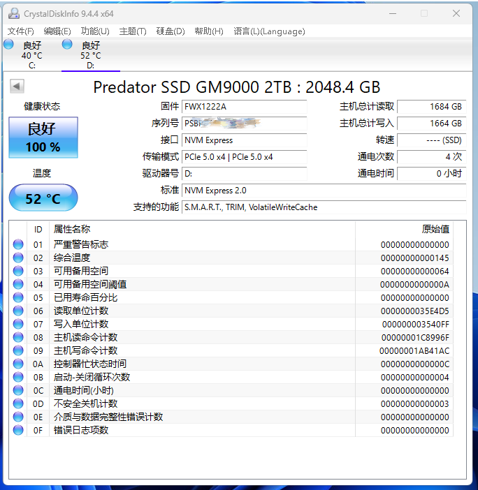 CrystalDiskInfo软件显示这个硬盘的一些技术指标。可以看到,硬盘设置是 PCIe 5.0x4 传输模式、NVM Express2.0标准,支持S.M.A.R.T.、TRIM、VolatileWriteCache 等功能。在跑完一系列测试软件,连续写入数据后,硬盘的温度也只有52摄氏度,控制得非常的不错。