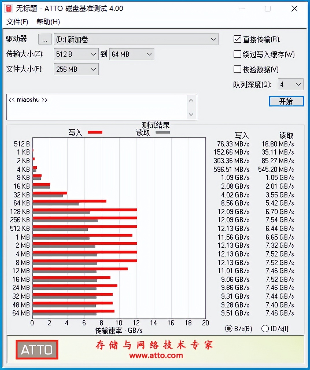 在 ATTO 软件的连续读写不同容量数据测试中,硬盘速度和稳定性表现良好,最高读取速度可达 12.13GB/s,写入速度为 7.54GB/s。在三款软件的测试结果基本一致。