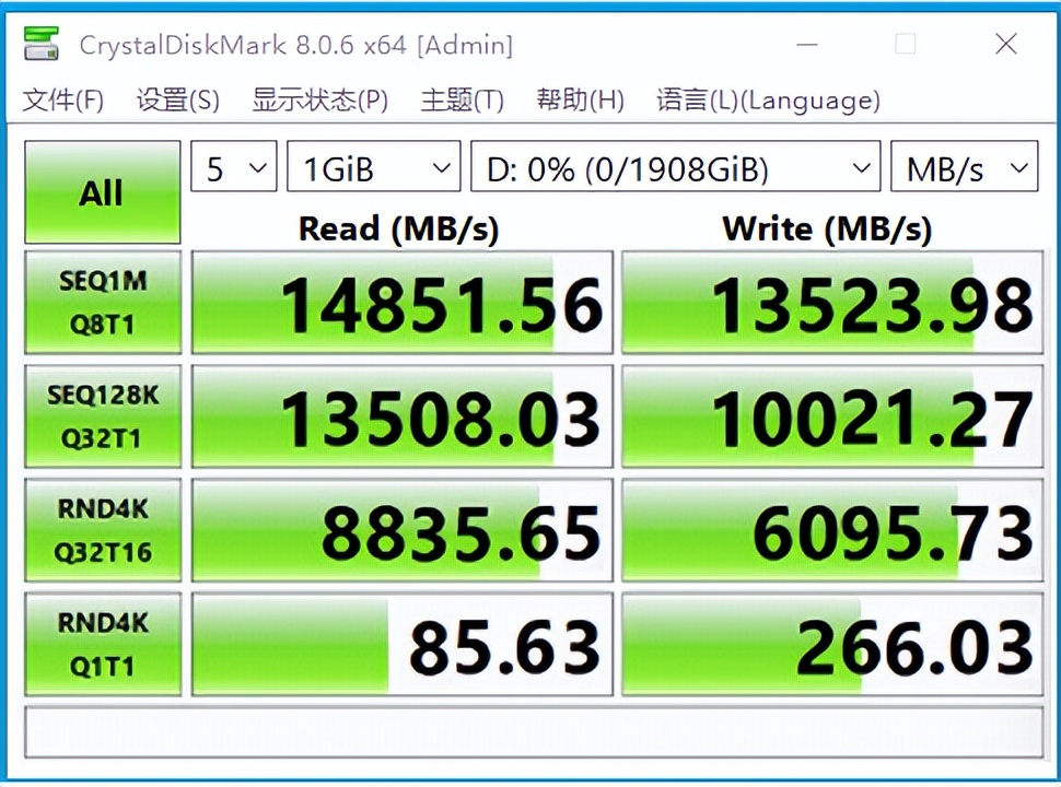 先用 CrystalDiskMark 跑个分,顺序读取直接干到14851MB/s,写入也有13523MB/s,比官方标得 14000MB/s 和 13000MB/s 还高一点,顺序读写性能几乎达到了 PCIe5.0 x4 通道的带宽上限。对比Gen4 SSD,读取直接翻倍,Gen5 的带宽在高速、高负载读写场景中优势太明显了。