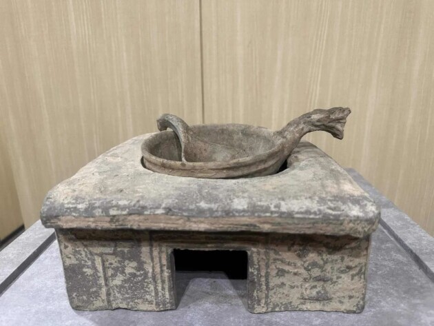 汉代陶灶,为整套器物,灶台上分别放置陶勺、陶罐,还辟有火眼,在煮食物的同时还可以加温热水。汉代,人们对灶极为重视。《汉书.五行志》称:“灶者 ,生养之本”。在汉代人的观念中,以为人死了等于去另一个世界继续生活,生者要“视死如生”,因此要为死者配置一套日常生活所需的器具。由此在墓中陪葬陶灶的习俗开始盛行起来,与陶灶相配的案、盘、杯、之类物品也一应俱全。