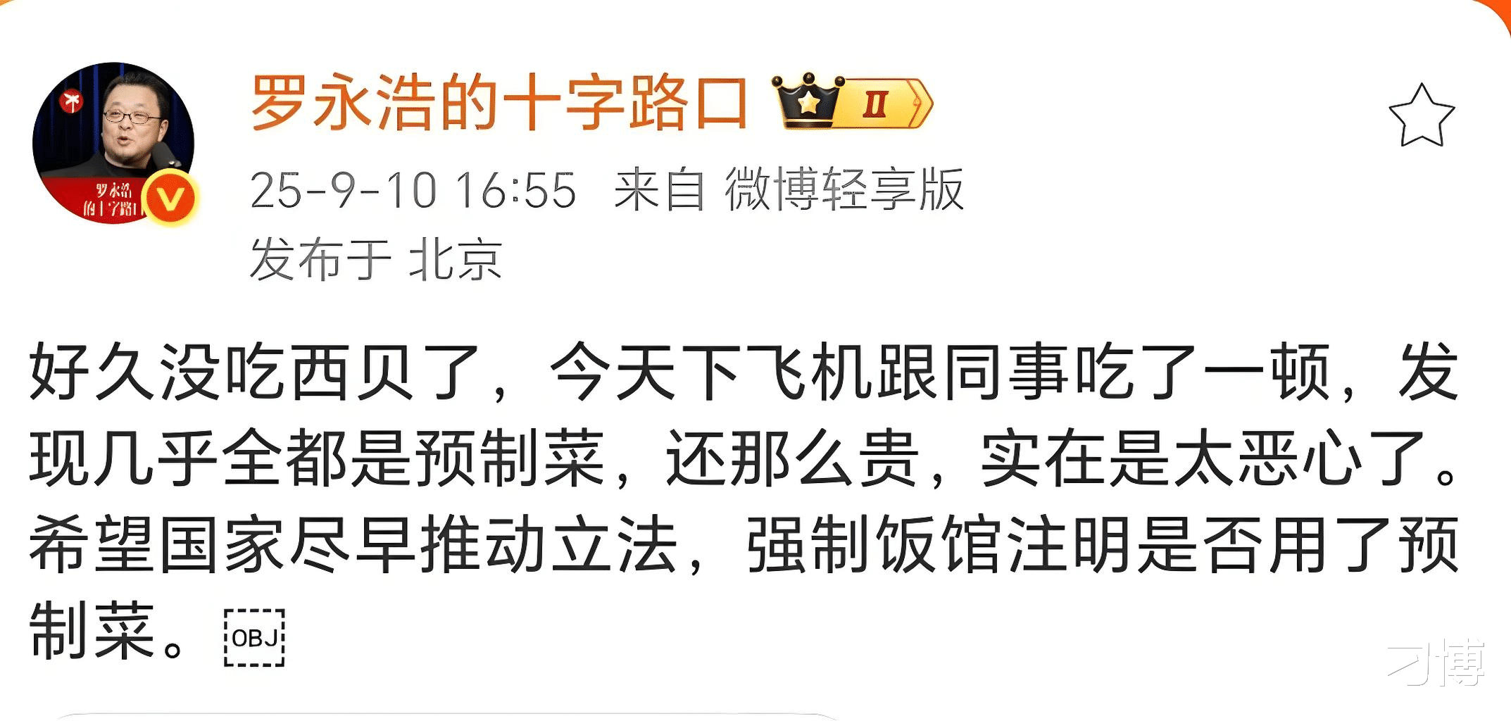 转眼到预制菜,情况也是一样。今天疯狂抵制预制菜的,有很大一批在用同样的疯狂抵制转基因。那些抵制者认识不到,如果按照他们的要求,首先要砸掉的恐怕是他们自家的冰箱。预制菜是什么,有国家的标准。预制菜能不能吃,有科学评判。西贝是否违规,有法律法规,有市场监管局。挑头抵制预制菜,或者挑头争取对预制菜的知情权,这是烫手的山芋。见好就收走为上才是罗永浩的上策。