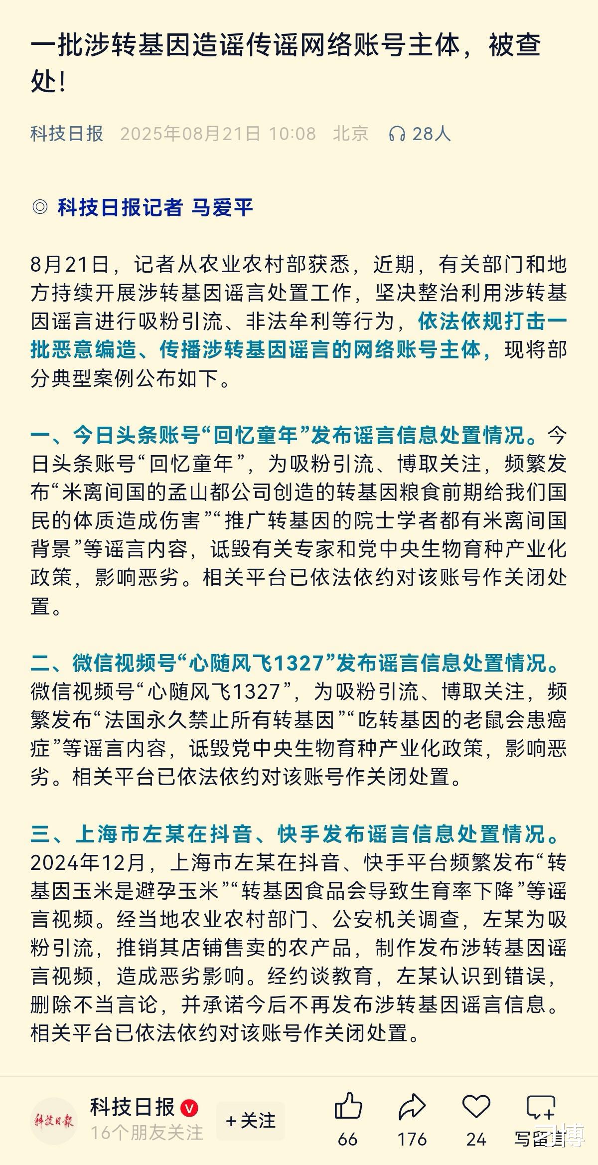 然而火爆的当天就有很多专业人员指出市场监管局的错误执法,因为《农业转基因生物标识管理办法》明确列出了需要标识管理的转基因生物(含转基因种子、转基因食品),用转基因大豆油加工后的菜成品不在需要标示的清单中,不属于法律意义上的转基因食品。国家市场监督管理总局也迅速出面纠正了错误执法,相关的错误报道以及正规媒体转载的报道被迅速删除。原本意气风发以为抓到了一个大瓜,不成想到头来是把自己弄得狼狈不堪。