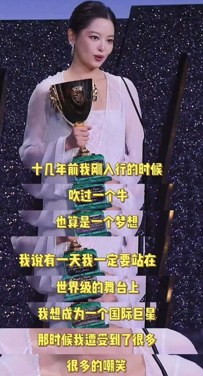 她说十几年前自己吹过一个牛,说要站在世界舞台上要做一个国际巨星,那时候遭到很多嘲笑,今天终于站在这儿了。
