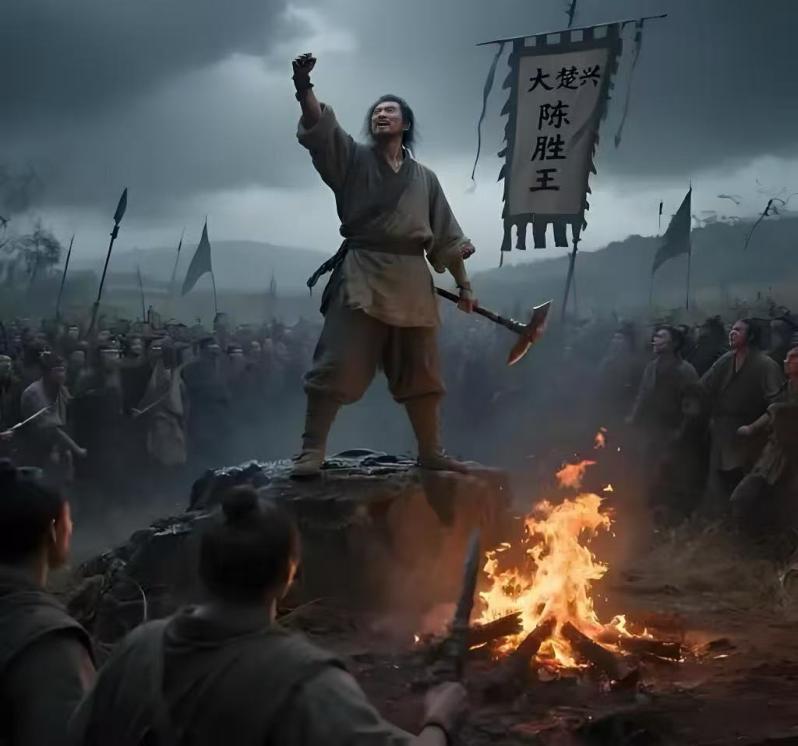 秦二世更不是个东西,他爹刚死,就接着修秦始皇陵,又征了几十万民工。民工们每天只能吃两顿稀粥,还得干十几个小时的活,稍微慢一点就被监工用鞭子抽。陈胜和吴广本来是押送民工的屯长,因为下雨耽误了行程,按照秦律得处死。陈胜当时就说 “反正都是死,不如拼一把”,结果几十个民工都跟着他反了。他们砍了木头当武器,举着竹竿当旗帜,才几个月,就有几十万农民加入。以前那么厉害的秦军,在这些农民面前根本不堪一击。你说,秦朝是被陈胜吴广推翻的吗?不是,是被自己的暴政逼垮的!