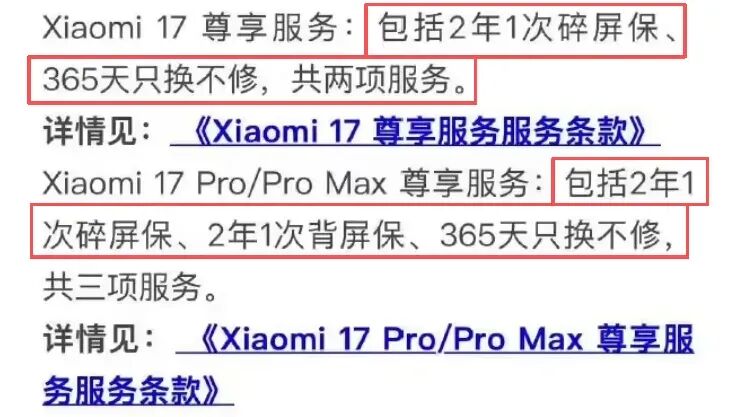 不过,今年小米的首发尊享服务也有小幅调整。和上代相比,电池保被取消,取而代之的是全系享有365天只换不修、2年1次碎屏保,而Pro系列还额外多了一个2年1次的背屏保。如果你打算入手,这些细节不妨提前留意。
